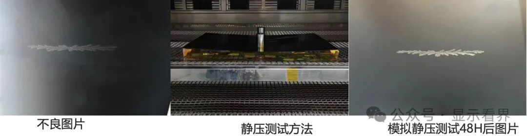 实验条件:50°C温度,90湿度,产品悬空后使用1Kg砝码放置在产品中间静压,24/48小时分别确认有无气泡扩散或新增