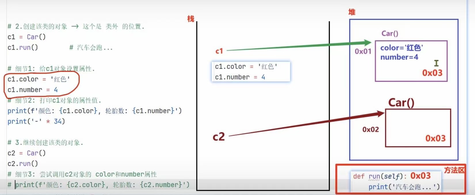 c2在堆中也存在了一个Car()对象,开辟了一个0x02的堆内存地址,c2指向此地址,Car对象有一个run函数,此函数在方法区开辟了一个0x03的地址,会存到堆中两个Car()中,只要是Car类里面就会有一块空间存0x03。所以color和number属性只有一个c1对应的Car()中有,所以只有c1可以访问,c2不能访问此属性;)