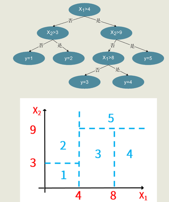 这种算法是根据两个特征 x1 和 x2 的值,以及标签 y 的取值,来对二维平面上的区域进行精准分割,以确定从特征到标签的映射规则。根据树的深度和分叉时所选择的特征的不同,我们可以训练出很多棵不一样的树来。