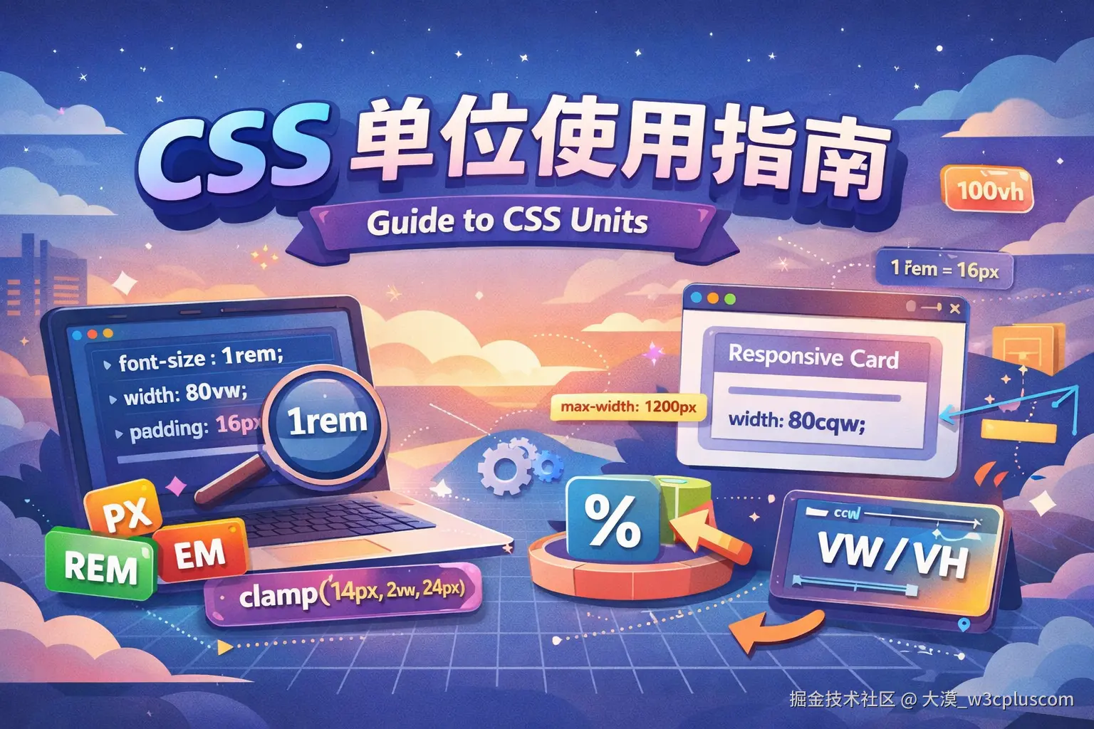 于是,我决定单独用一节课,把这些零散的问题集中起来,好好聊一聊。我们不再孤立地看某一个单位,而是把 px 、em 、rem 、% 、视窗单位(如 vw 、vh)、容器查询单位(如 cqw 、cqh)以及 ex 、ch 和 lh 放在同一个语境下,重新理解它们的作用,以及更重要的------如何做出选择。