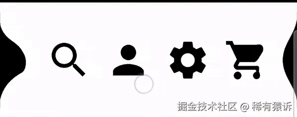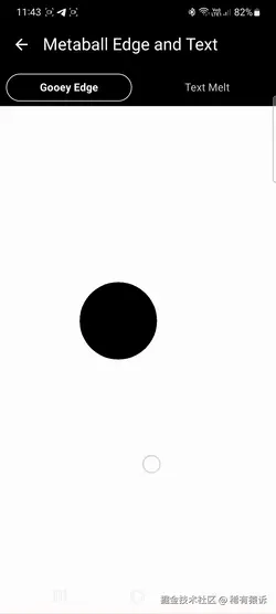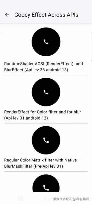 我还尝试在两个带轮廓的圆形按钮之间实现 Metaball 效果------方法相同,但使用的是描边而不是填充形状。与颜色矩阵不同,AGSL 允许在特定的 alpha 范围内进行过滤,这使得渲染成为可能(参见 Supra 部分的底部):