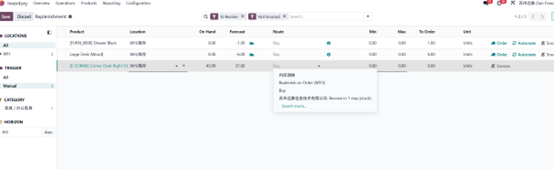 点击「采购」按钮后,Odoo 会为该产品生成一次性采购的报价单。若选择「自动化」选项,当库存水平低于设定的最低数量时,系统将自动创建补货订单。
