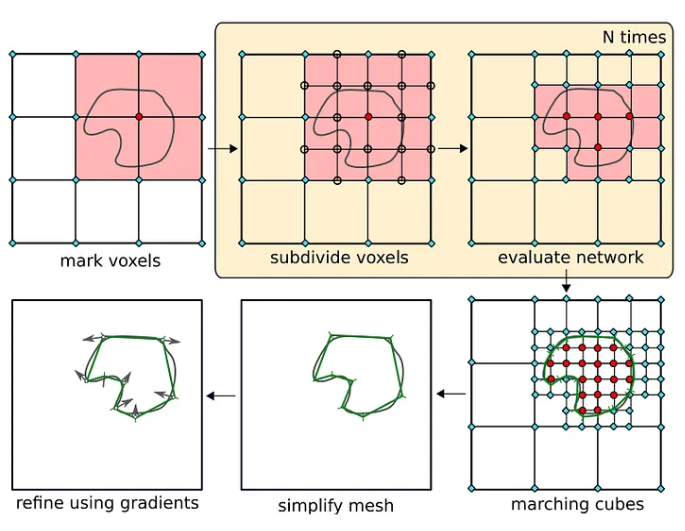 至于在提取物体表面网格(Mesh)的推断(Inference)上,ONet提出了多分辨率等值面提取 (Multiresolution IsoSurface Extraction, MISE)的方法。该方法通过渐进式地构建八叉树(利用ONet评估空间是否被占据),再结合行进立方体(Marching Cube)算法,最终提取出高分辨率的物体表面网格。