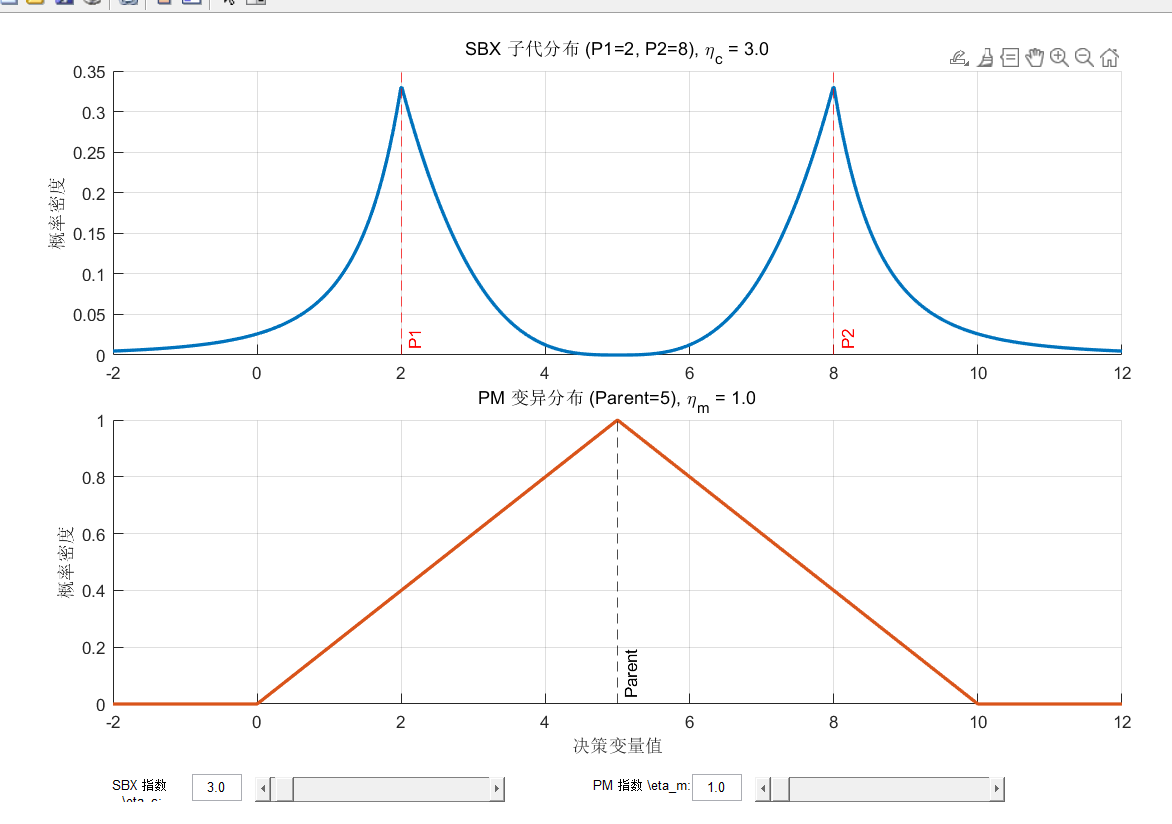 光看公式难免枯燥。我编写了一段 MATLAB 脚本,利用其强大的 UI 交互功能,将 SBX 和 PM 的概率密度分布进行了可视化。