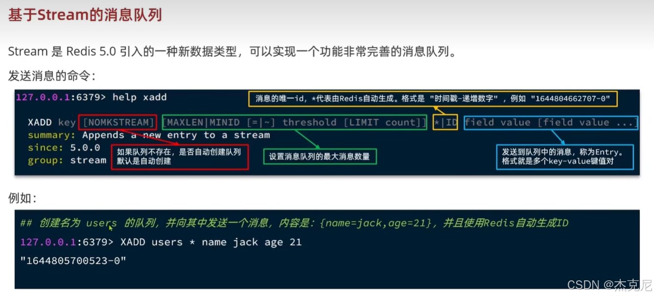 xaddRedis Stream 消息队列 的 添加消息命令= 往消息队列里扔一条消息