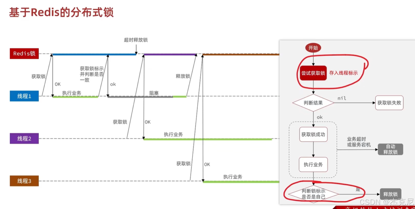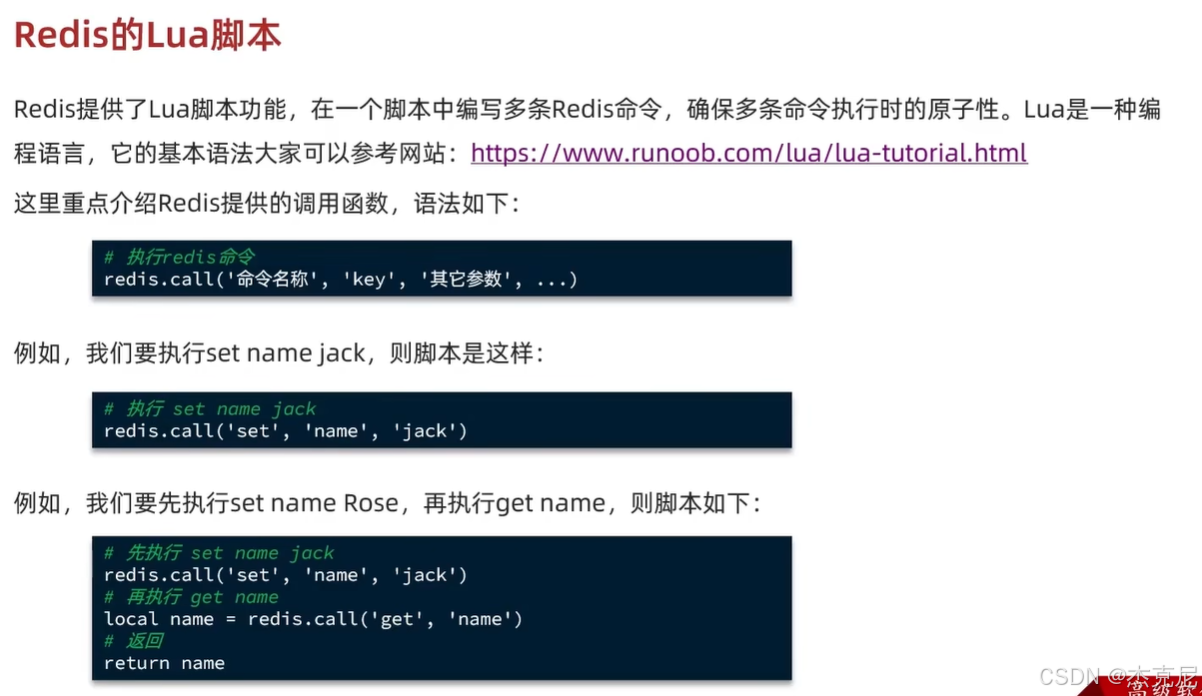 Lua//Lua脚本 -- 比较线程标示与锁中的标示是否一致 if(redis.call('get', KEYS[1]) == ARGV[1]) then -- 释放锁 del key return redis.call('del', KEYS[1]) end return 0