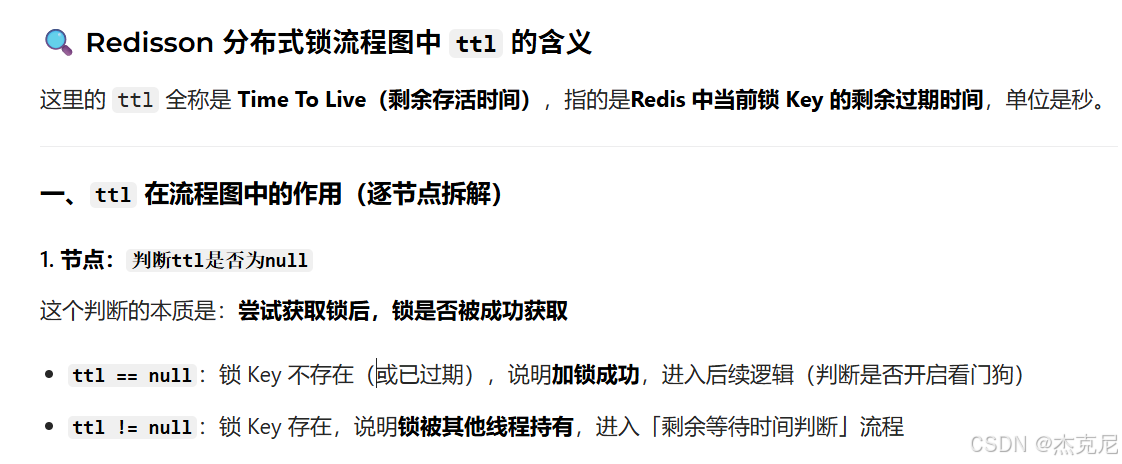 SETNX锁设置固定过期时间,若业务执行时间超过过期时间,锁会自动释放,导致其他线程加锁成功,出现并发安全问题。Redisson 解决方案:看门狗(WatchDog)自动续期机制