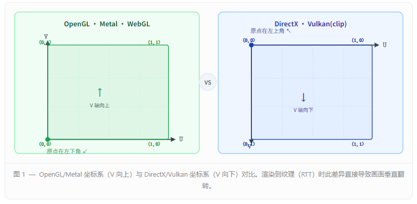 Vulkan 的特殊性: Vulkan 的 NDC(标准化设备坐标)clip space Y 轴向下(与 DirectX 一致),但 framebuffer 存储仍与 OpenGL 相同。Unity 的抽象层已处理这一差异,但手写 Native RenderPass 时需格外留意。