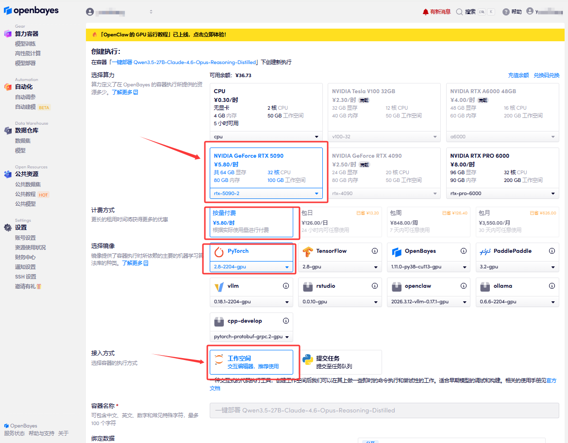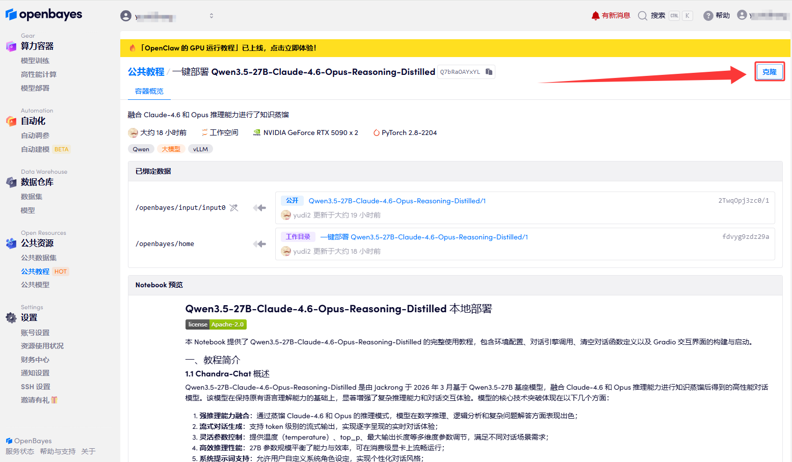 首先点击「公共教程」,找到「一键部署 Qwen3.5-27B-Claude-4.6-Opus-Reasoning-Distilled」,单击打开。
