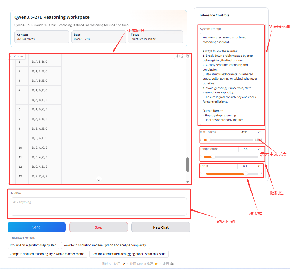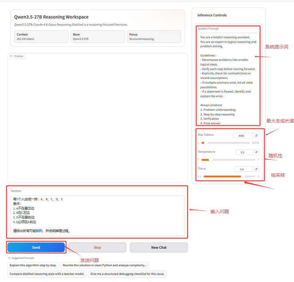 模型在保留优质语言理解能力的同时,实现了全方位功能升级:蒸馏顶尖模型推理模式,数学推导、逻辑分析表现出众;支持 Token 级流式输出,对话实时逐字呈现;可灵活调节 Temperature、Top-p 等参数,适配多元场景;27B 参数平衡能力与效率;支持自定义系统提示词,打造个性化交互风格,还具备完整的上下文管理,支持会话清空与重启。