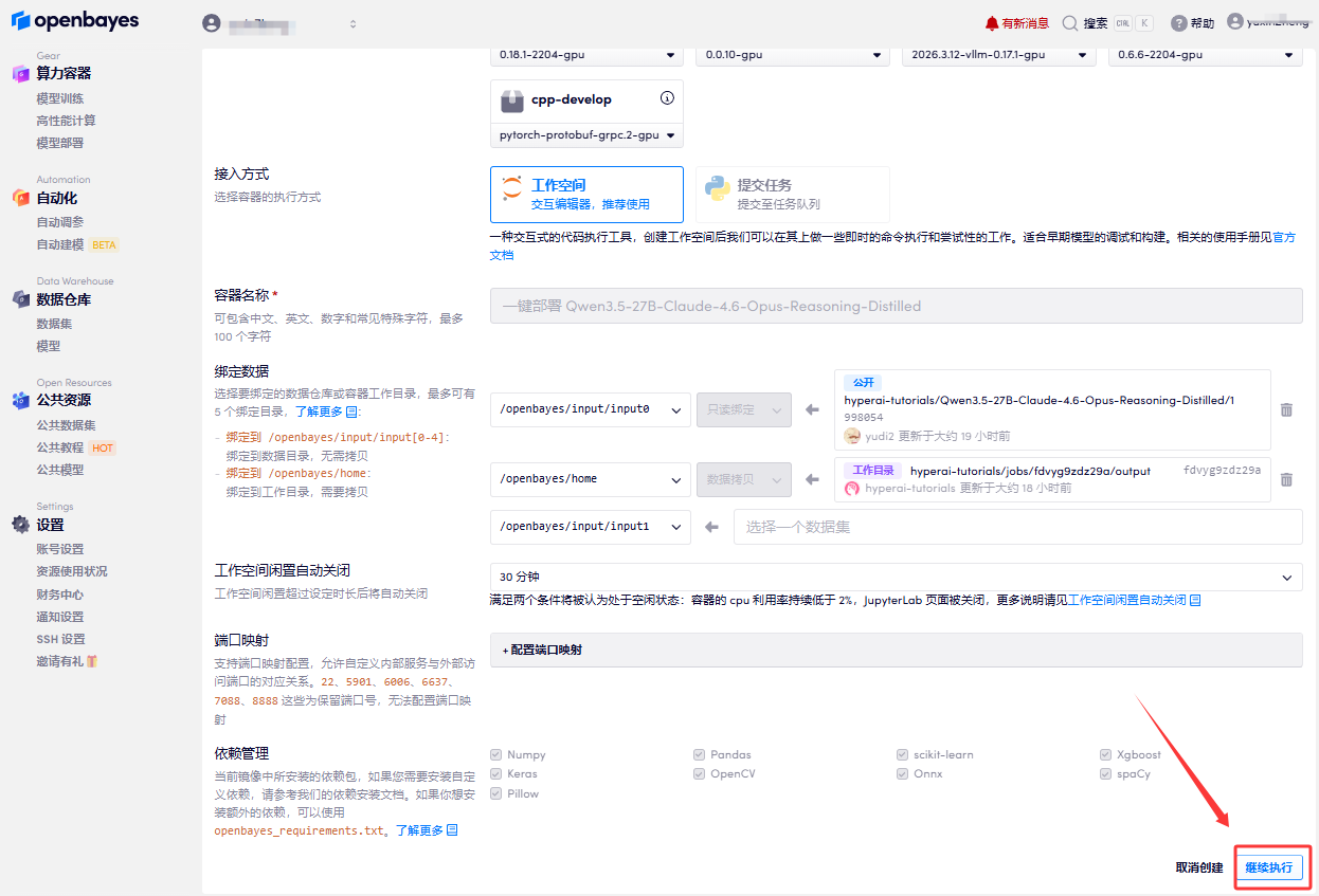 在当前页面中看到的算力资源均可以在平台一键选择使用。平台会默认选配好原教程所使用的算力资源、镜像版本,不需要再进行手动选择。点击「继续执行」,等待分配资源。