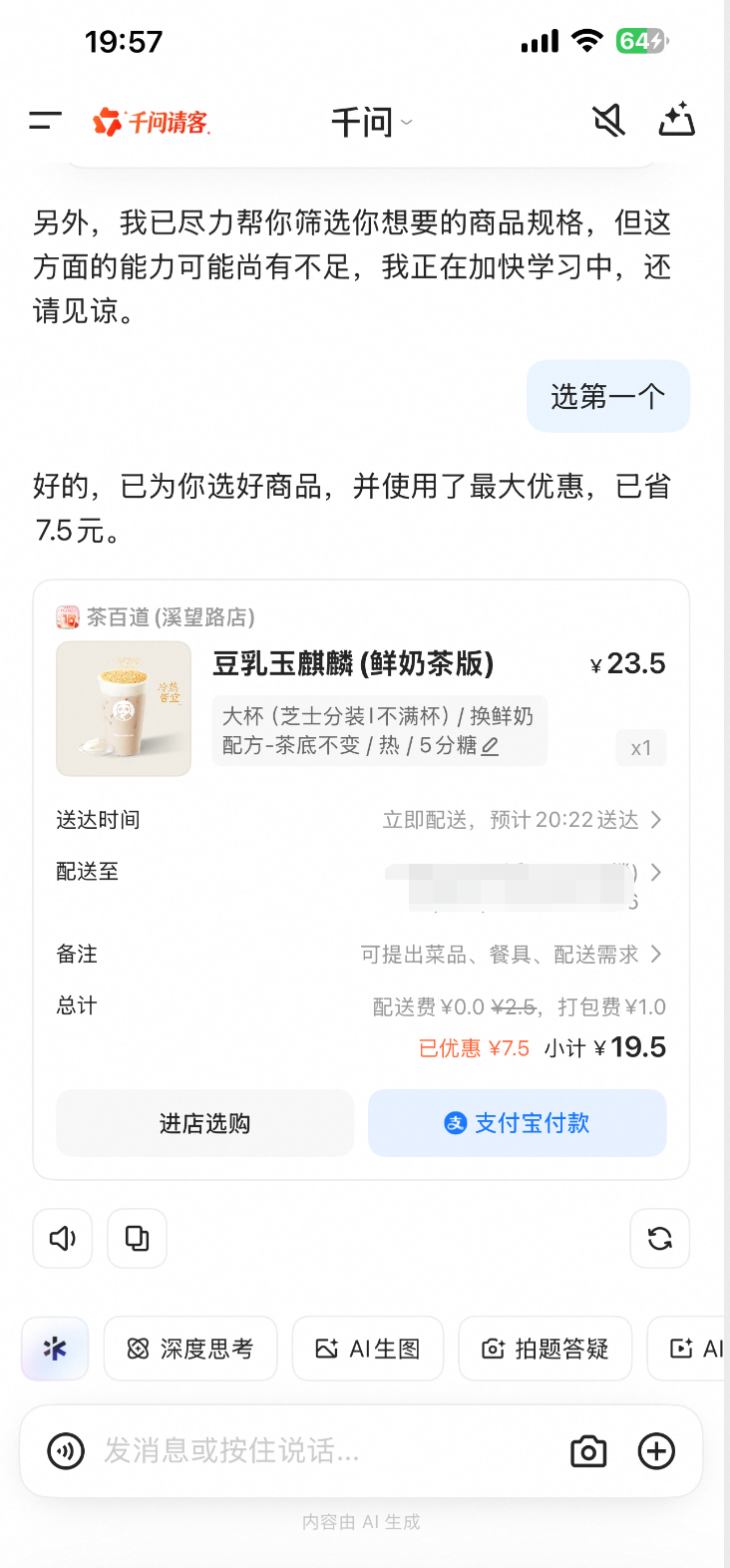 淘宝闪购 Agent 支持用户通过自然语言完成从导购到下单支付的完整点单流程,目标是将传统 3-5 分钟的点单耗时压缩至 30 秒以内。一次典型的多轮对话如下: