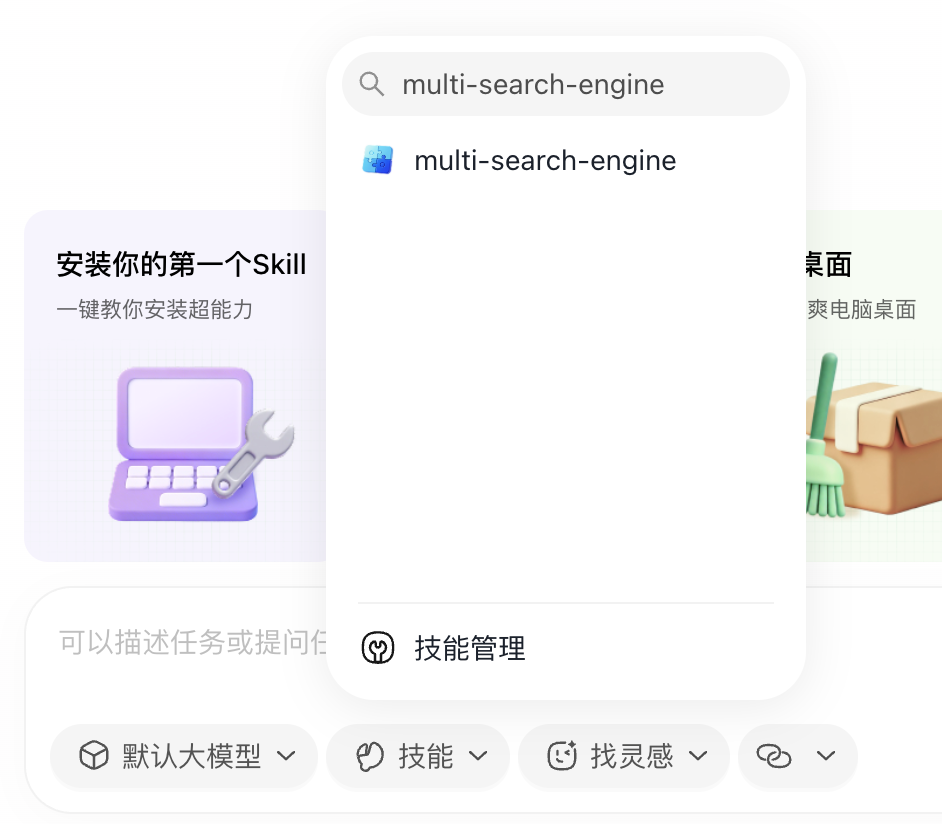 第三步,调用Skill并输入Prompt,下达具体任务。返回对话窗口,搜索并选中【multi-search-engine】Skill,在对话框中输入清晰的指令,明确任务需求------指令越具体,QClaw的执行效果越精准,这也是玩虾大赛中Prompt玩法的核心技巧。