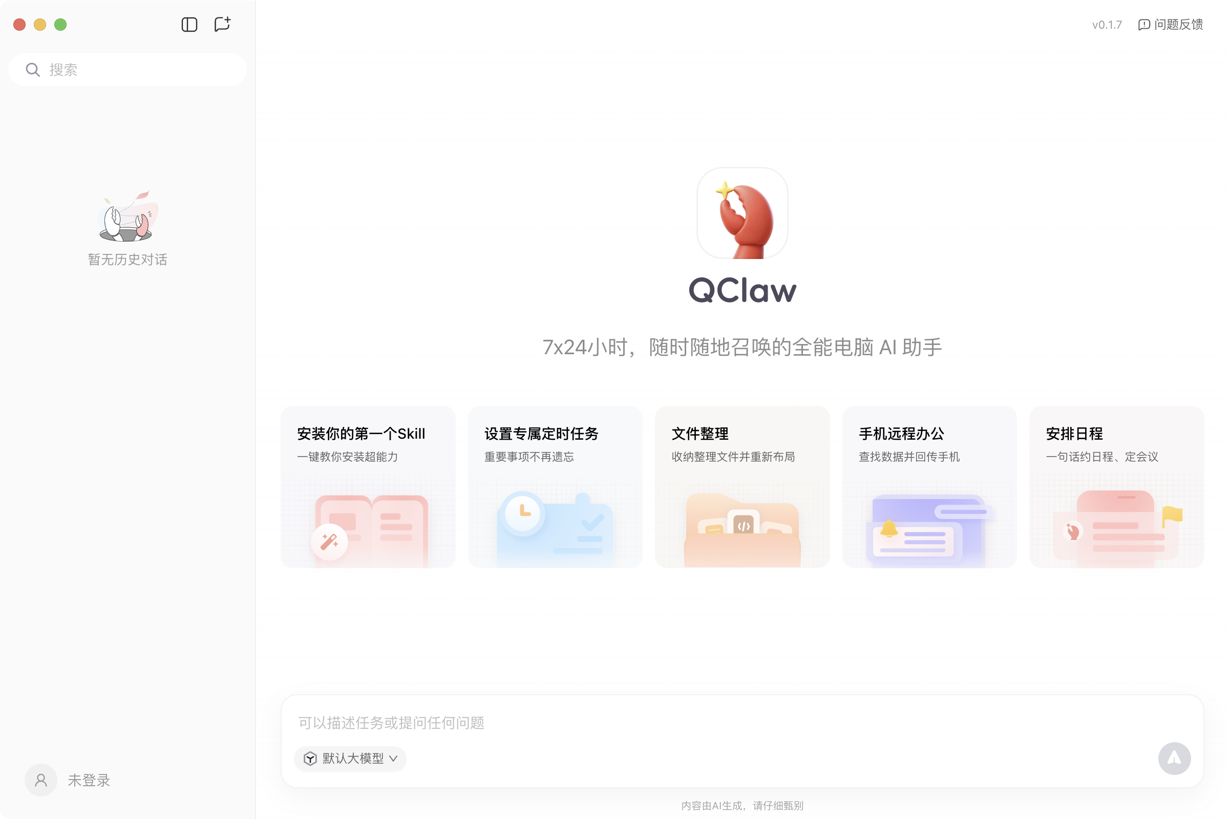 第一步,打开QClaw并完成登录,进入主对话界面。作为腾讯免费推出的AI助手,QClaw内置多款顶尖大模型,无需额外付费,直接选择默认大模型即可开始使用,零成本上手适配。