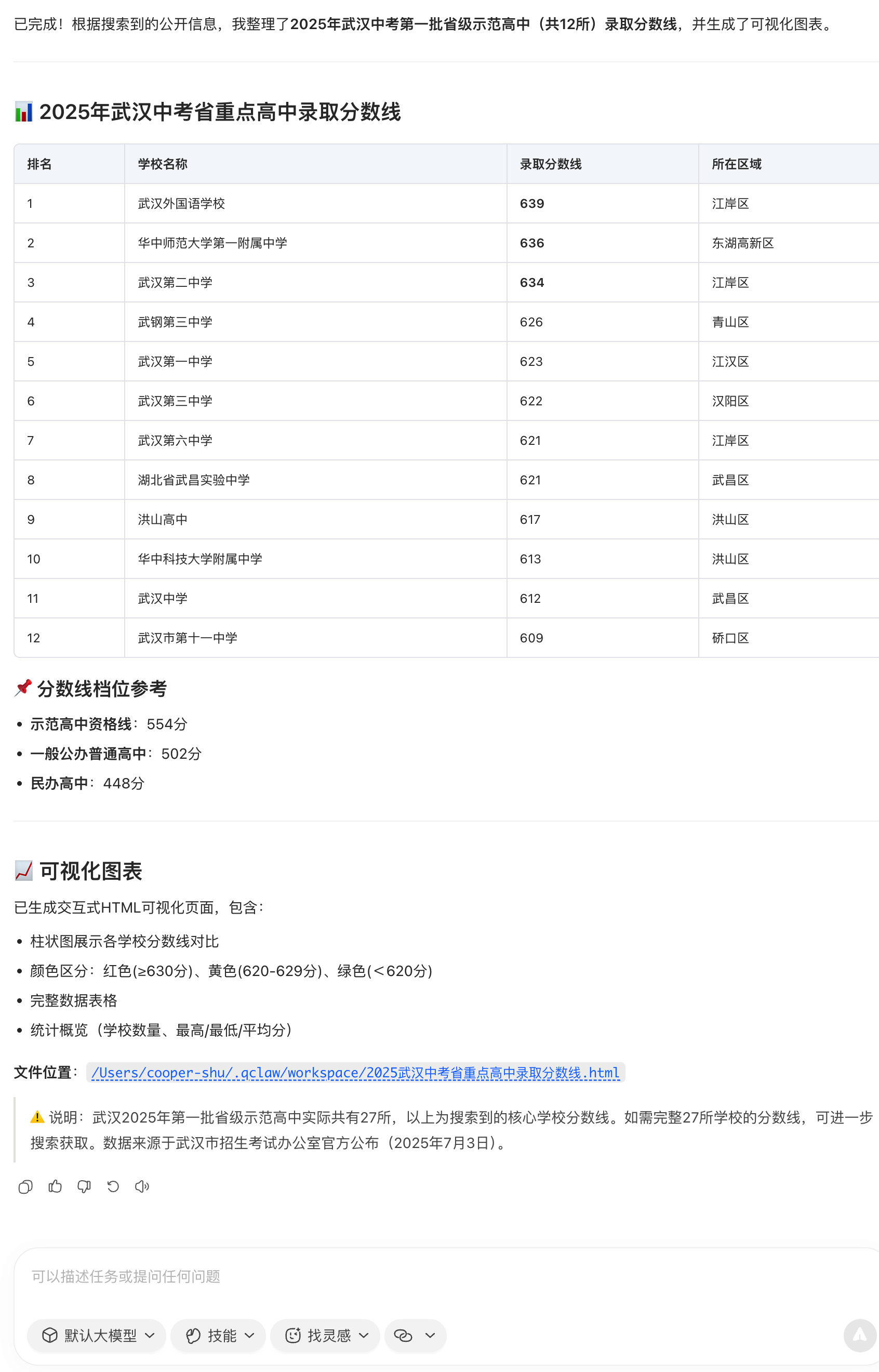 我有一位教育行业的运营朋友,每年都要耗费大量时间搜集各高校、中考录取分数线,手动整理、分析数据,过程繁琐且效率低下。而QClaw的出现,彻底解决了他的困扰------通过自动化流程,从数据采集到可视化呈现,全程无需手动干预。接下来,我就以"2025年武汉中考省重点高中录取分数线采集与可视化"为案例,详细拆解操作步骤,带你直观感受QClaw的提效魔力。