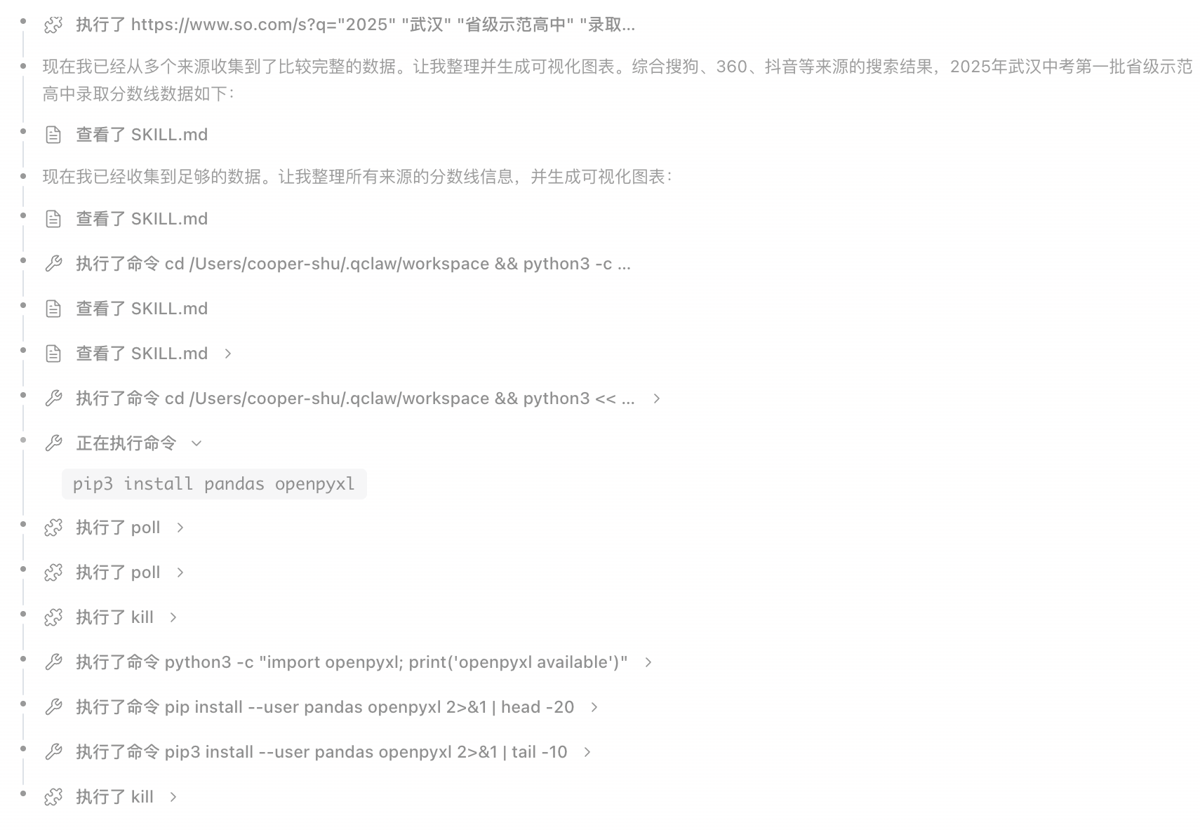 第五步,生成可视化内容。数据采集完成后,QClaw会自动调用Python工具进行数据可视化(若电脑未安装Python,需自行安装,安装过程中QClaw会自动配置相关依赖,耐心等待即可)。这一步无需手动编写代码,即便不懂编程,也能快速获得专业可视化结果,完美解决教育从业者数据分析门槛高的痛点。