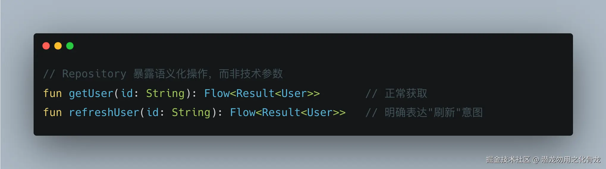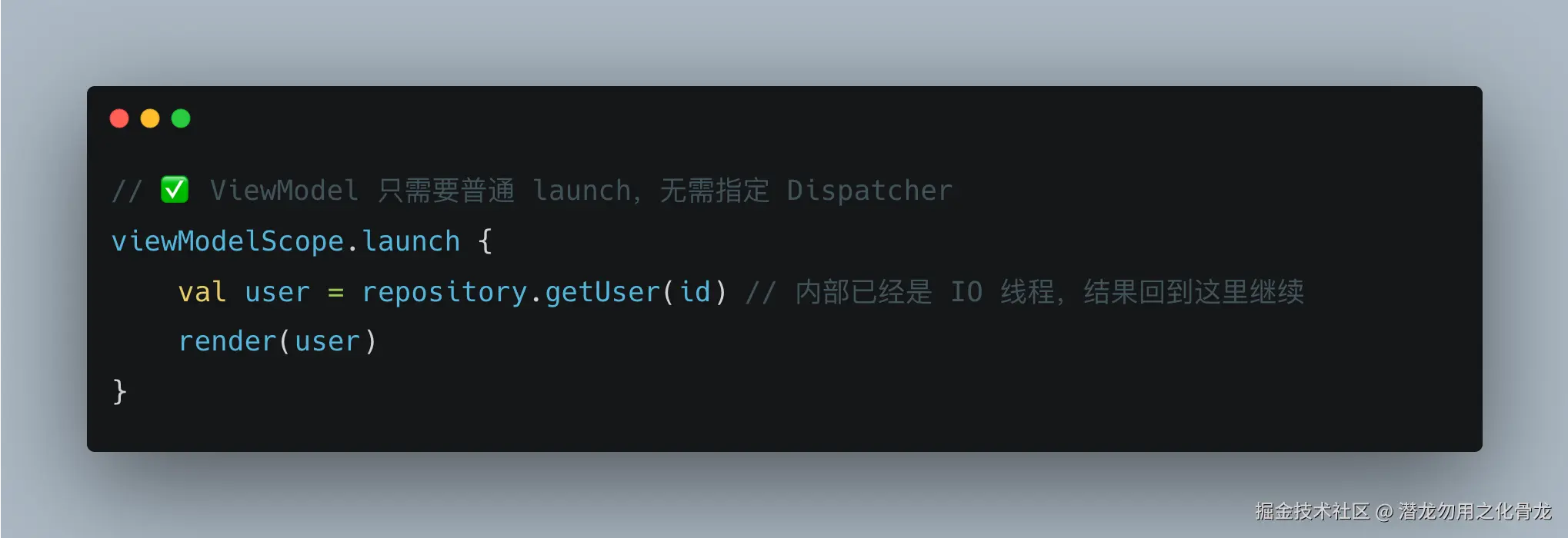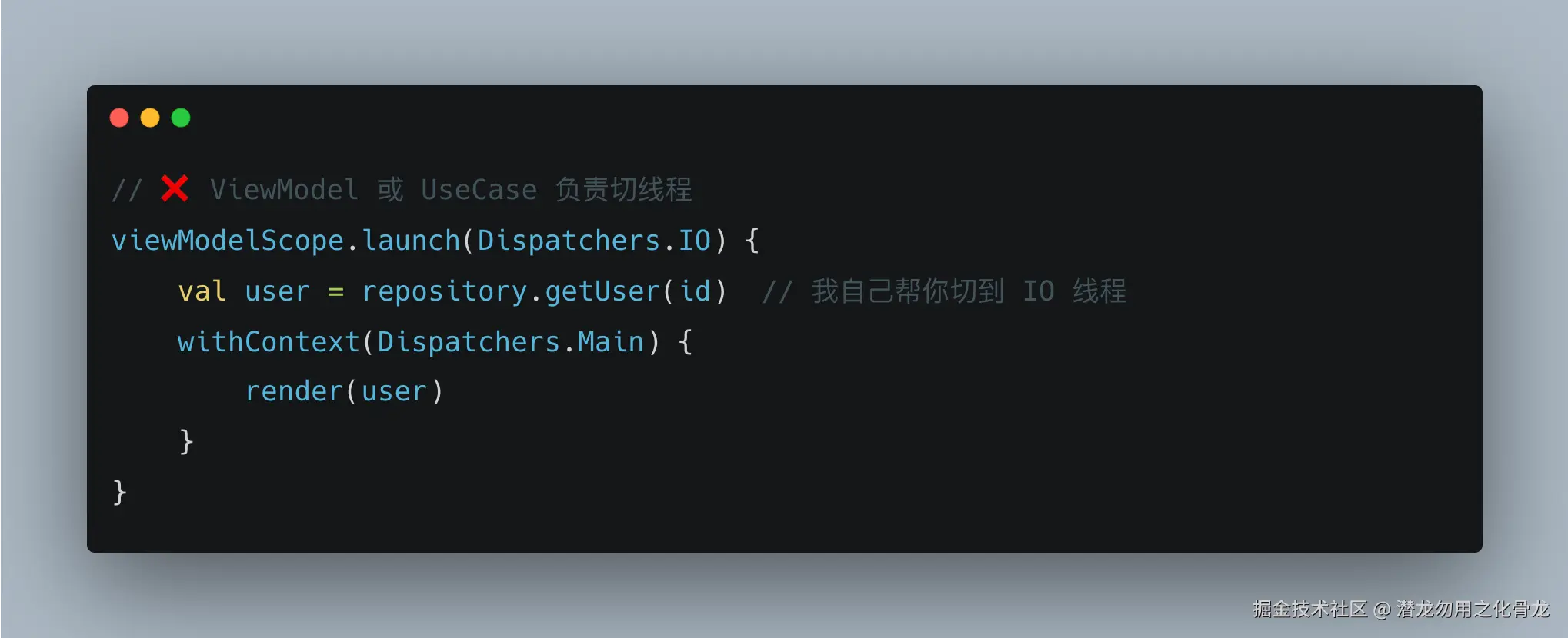 表面上看没问题,但这背后的含义是:ViewModel 知道 getUser 是一个 IO 操作。