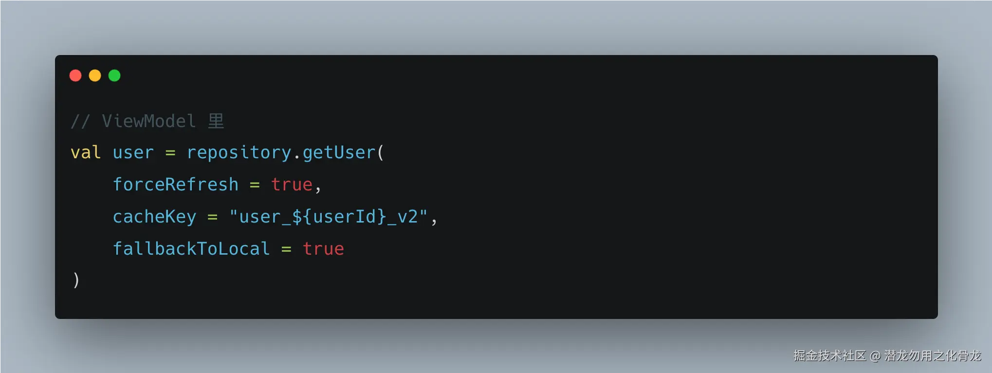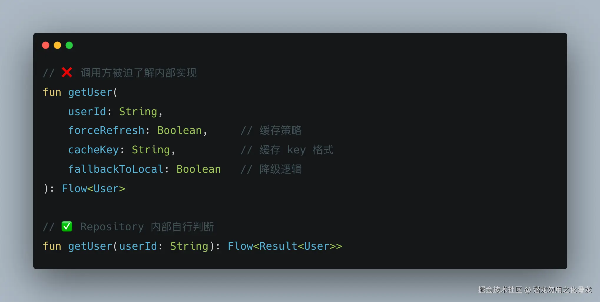 forceRefresh、cacheKey、fallbackToLocal 这些参数,是 Repository 自己的内部决策,不应该暴露给 ViewModel。你把参数暴露出去的那一刻,就是在告诉调用方:你来决定怎么取数据吧。
