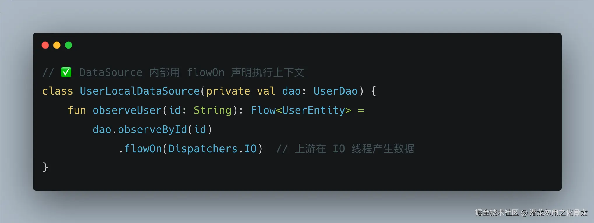 当 DataSource 返回 Flow 时,线程控制用 flowOn,它影响的是上游的执行线程,语义更精确: