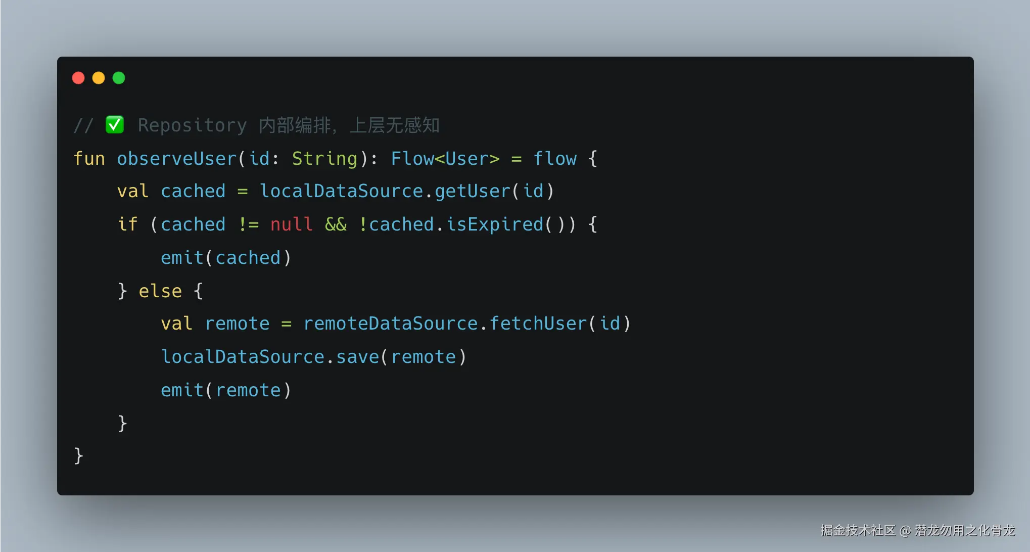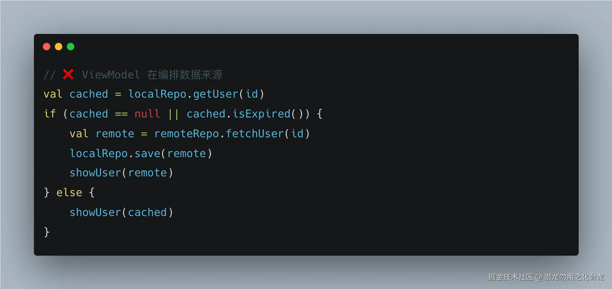 这段逻辑本属于 Repository,写在 ViewModel 里是严重的职责错位。Repository 的核心价值之一,就是对上层屏蔽数据来源: