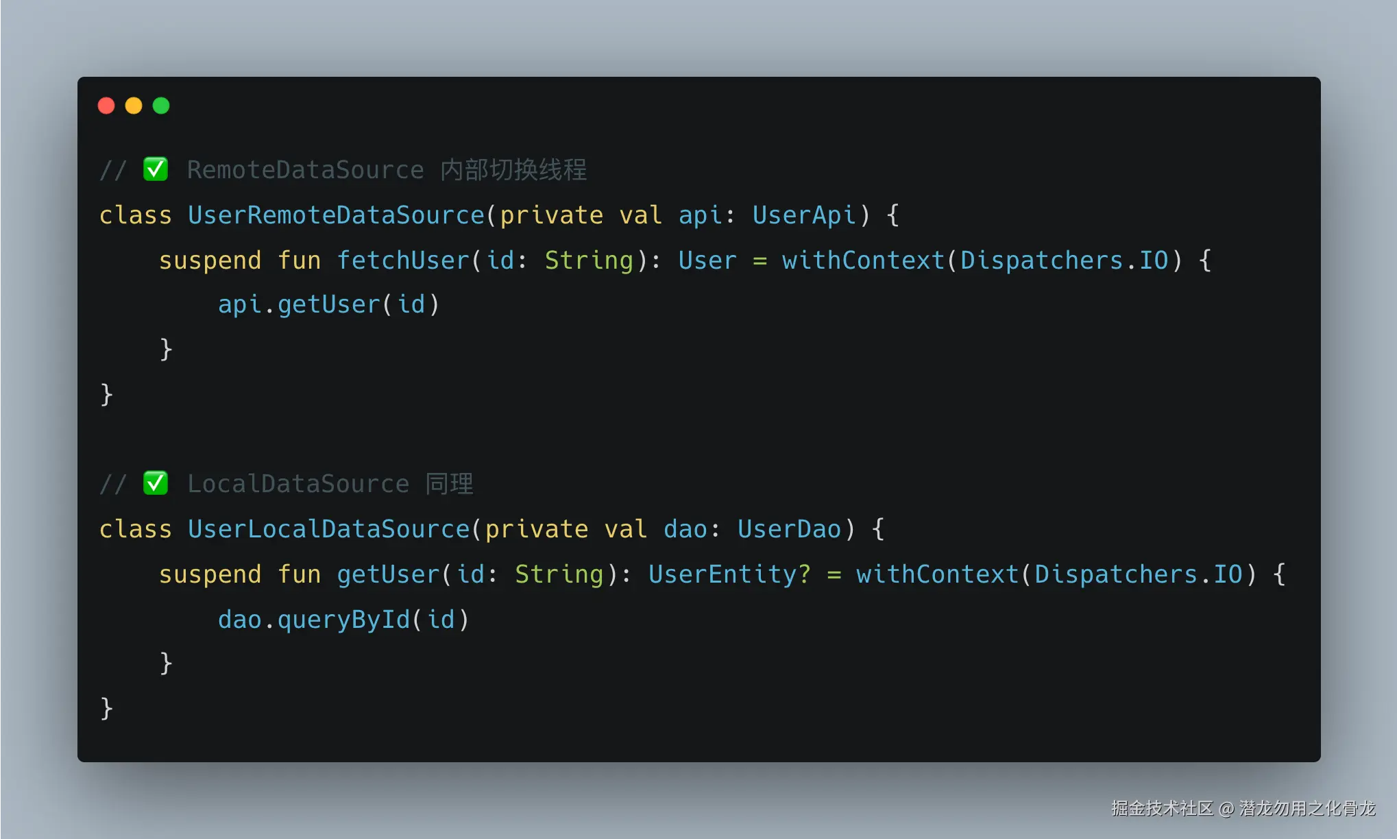 | RemoteDataSource | 网络 IO、协议细节 | 网络重试、异常转换、线程切换 |
