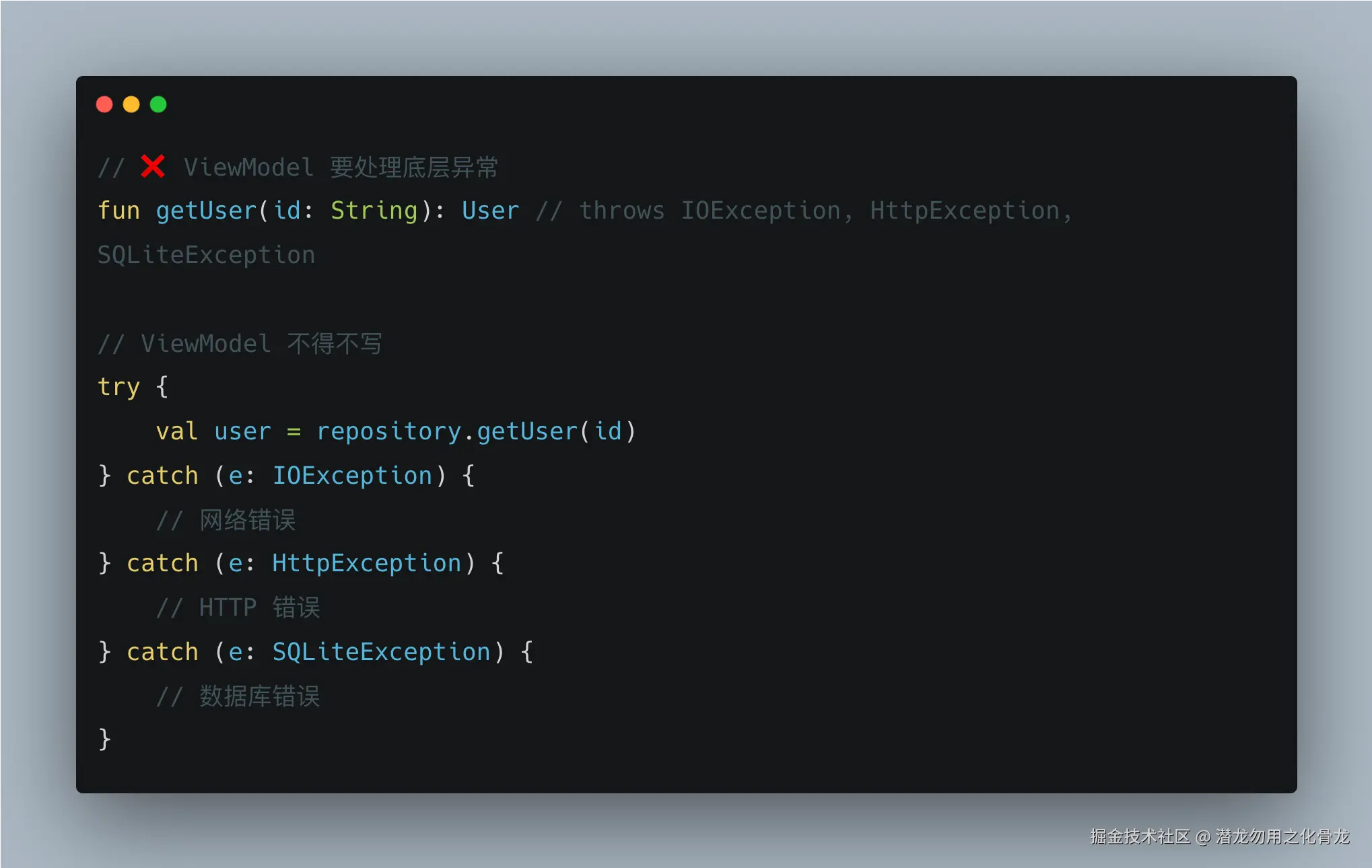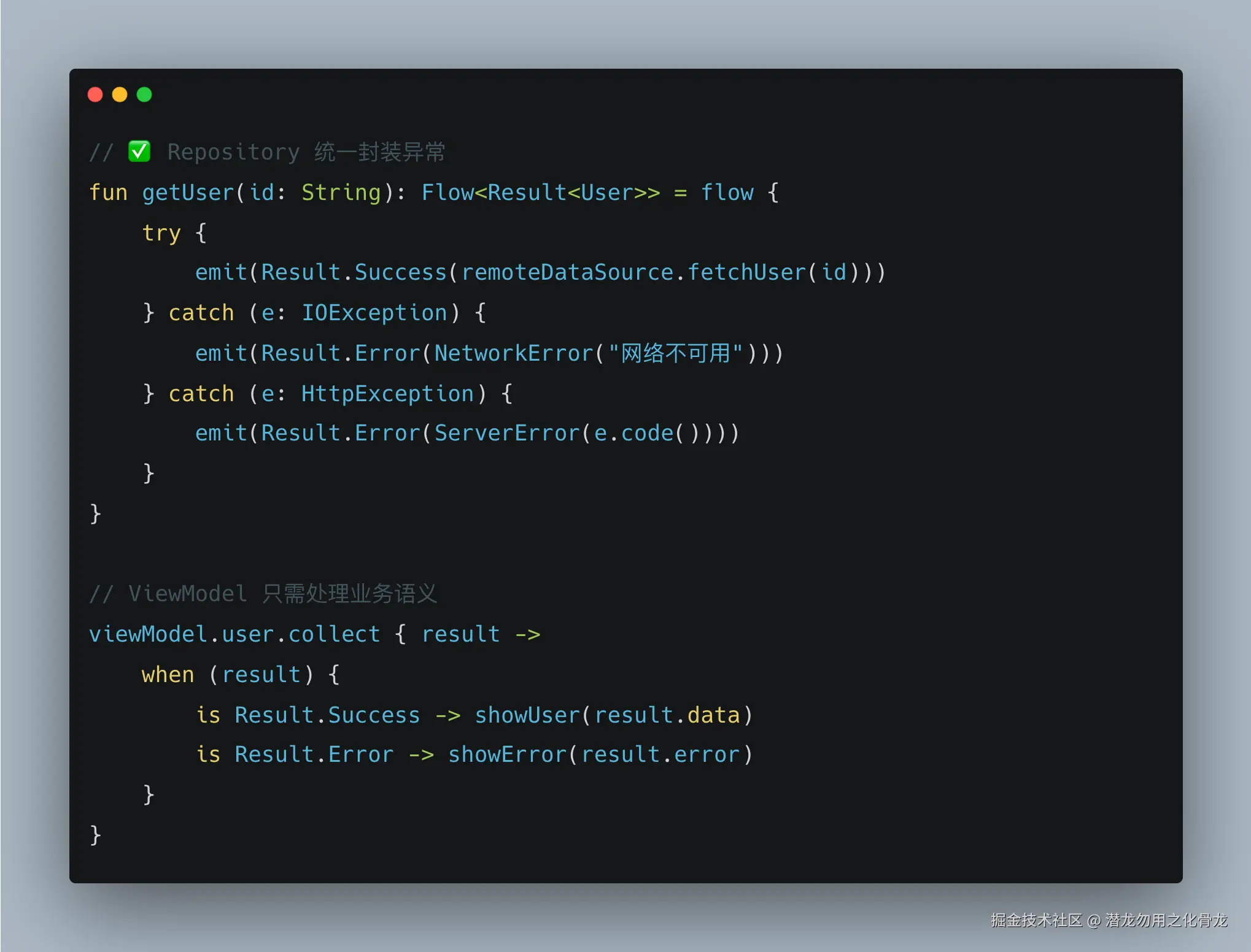 ViewModel 根本不该知道 HttpException 和 SQLiteException 是什么。这些是底层细节,Repository 应该把它们消化掉,转换成业务语义: