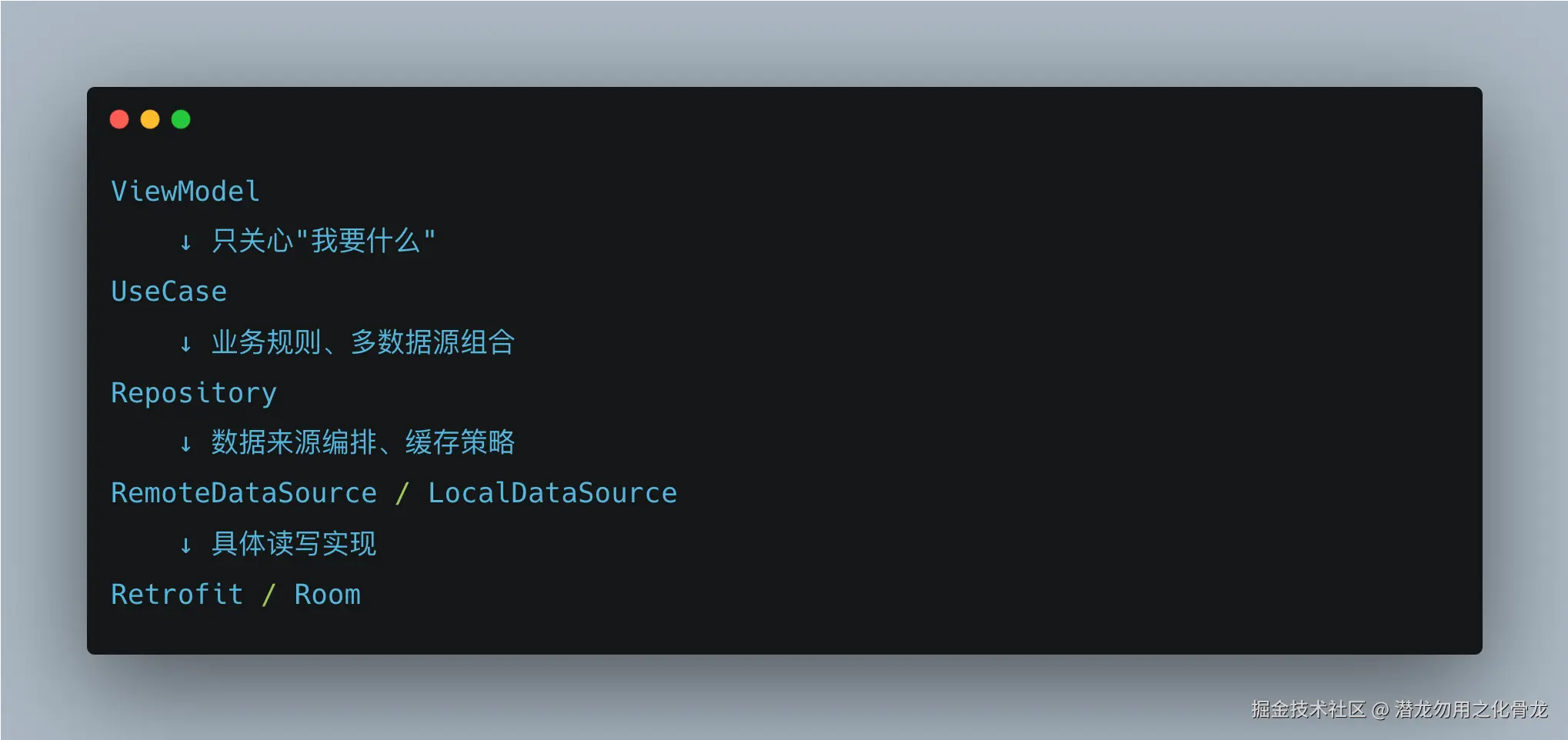 | ViewModel | 用户意图、UI 状态 | 只管"我要什么数据",无需感知线程 |