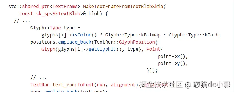 同时,通过 flutter / engine / impeller / typographer / backends / skia / text_frame_skia.cc 可以看到,即使是 Impeller 的 Typographer 后端,也叫 TypographerContextSkia,它从 SkTextBlob(Skia 的文本对象)中提取 Glyph 信息,然后用 Impeller 自己的渲染管线去绘制 :