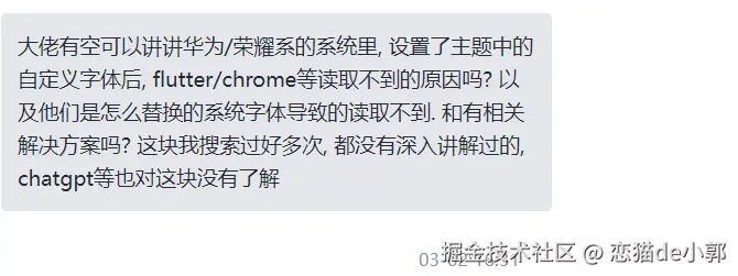 这就是为什么 Flutter 至今无法自动渲染手机厂商的自定义主题字体的原因,问题不在 Impeller 还是 Skia,问题在「字体发现」这一层用的是文件解析而非系统 API。