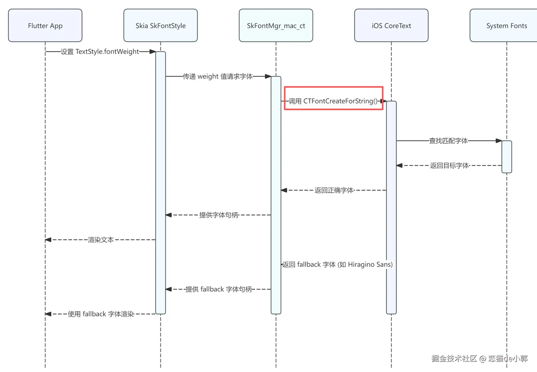主要原因是因为 CTFontCreateForString() 的 API 不会保留输入字体的 fontWeight,一般来说,Flutter 的文本渲染链路是: