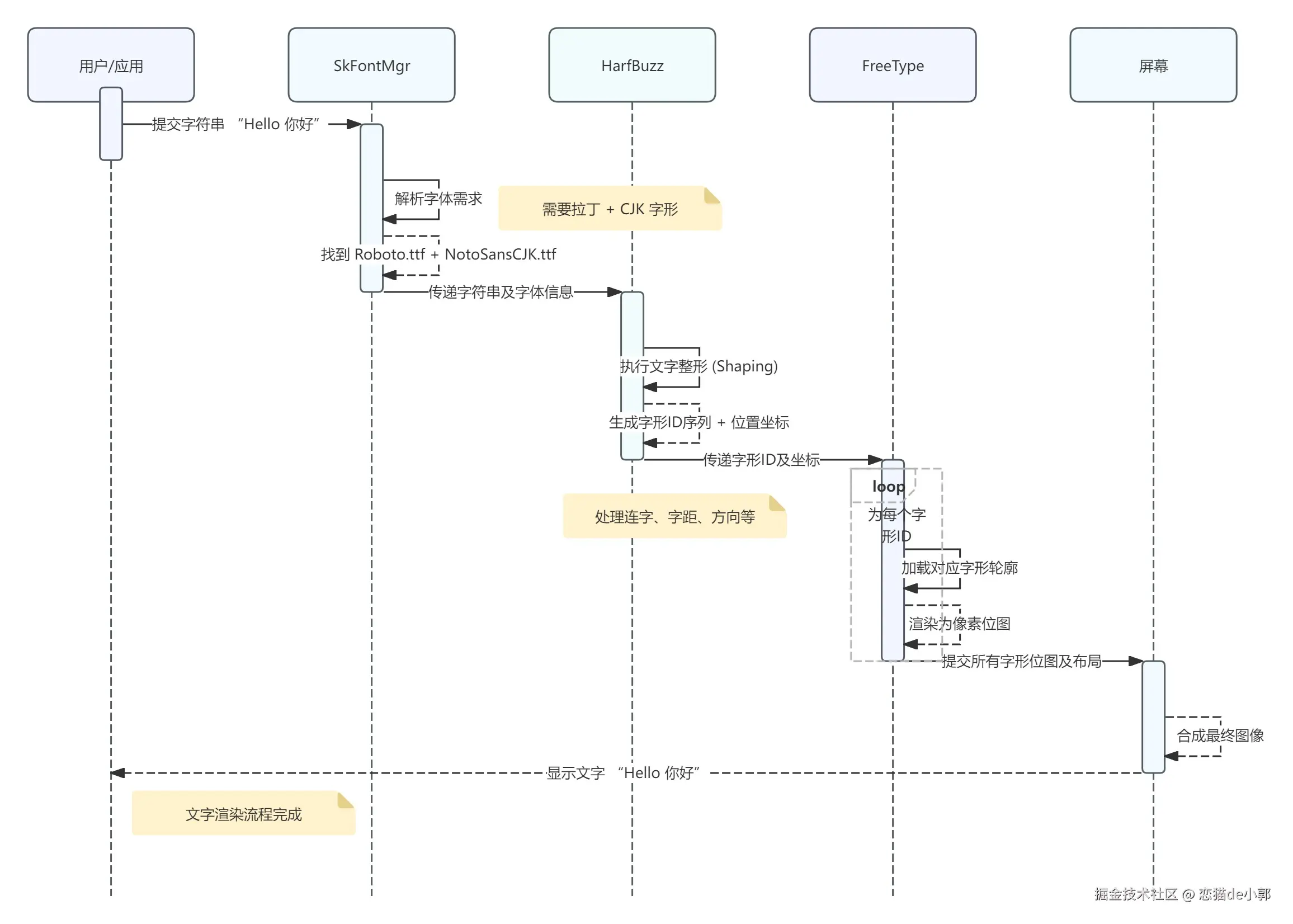 Dart (TextStyle) -> C++ Engine (Libfont) -> Skia (SkFontMgr) -> 直接读取.ttf 文件 -> GPU 绘制