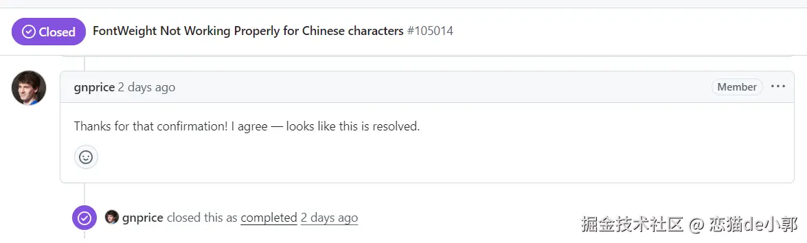最后,不得不提一下,我 2022 年提的一个中文字重渲染不对的问题,最近终于被解决了,太感动了:
