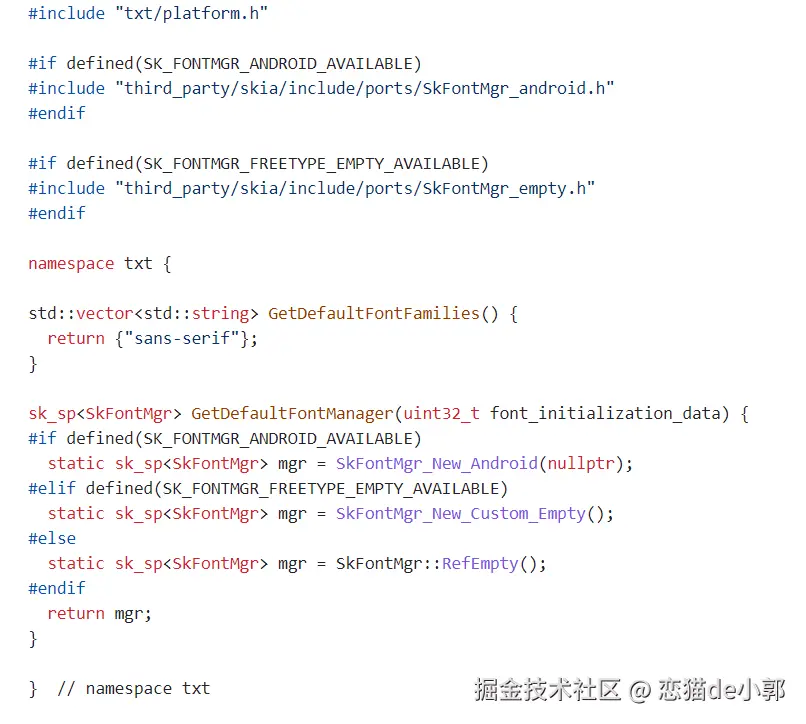这里的 SkFontMgr_New_Android(nullptr) 就是 Skia 提供的 Android 字体管理器,传入 nullptr 意味着使用默认配置 ,也就是去解析 /system/etc/fonts.xml 来发现系统字体,这个 SkFontMgr_New_Android 内部就使用了 FreeType 来解析字体文件。