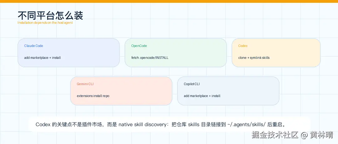 如果你用的是 Codex,它走的是原生 skill discovery。也就是把仓库 clone 到本地,再把 skills/ 目录通过符号链接暴露给 ~/.agents/skills/: