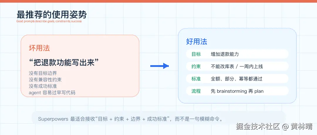 Superpowers 最好的用法,不是背一堆命令。而是学会把任务交给它的方式,改成"目标 + 约束 + 边界",而不是"立刻给我代码"。