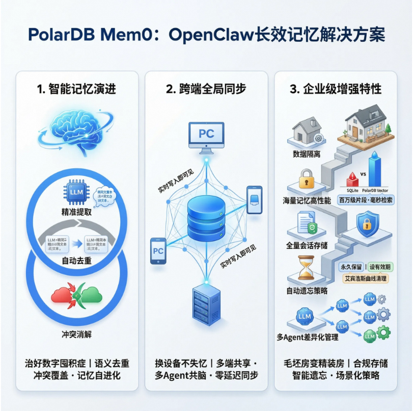 PolarDB Mem0是一款为AI Agent构建专属长效记忆的托管服务,100%兼容开源的Mem0系统。结合PolarDB Vector,将云原生能力与 Mem0 的智能记忆引擎深度融合,为 OpenClaw 提供持久化、智能化、企业级的长效记忆解决方案: