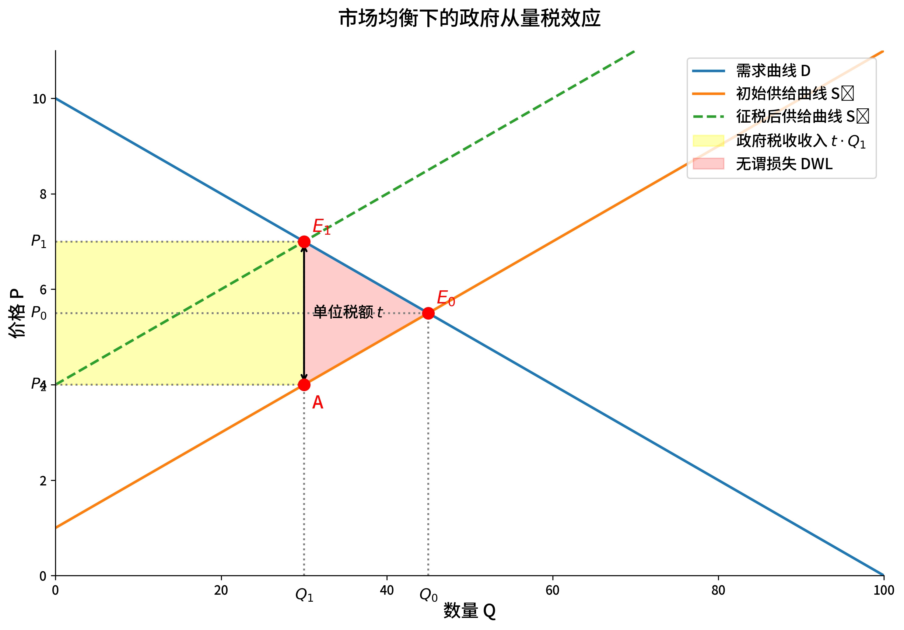 征税使得生产者剩余从P0E0为底的下三角变为以P2A为底的下三角,生产者得益受损