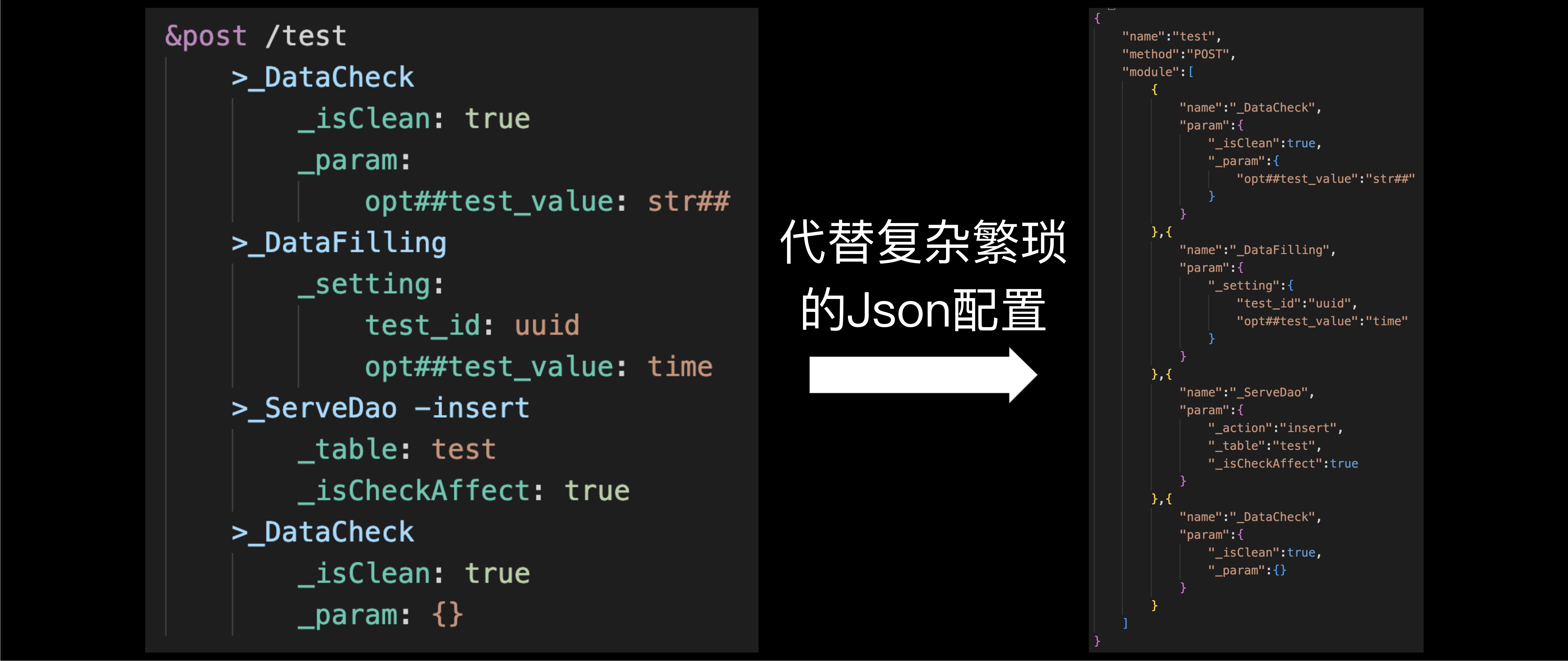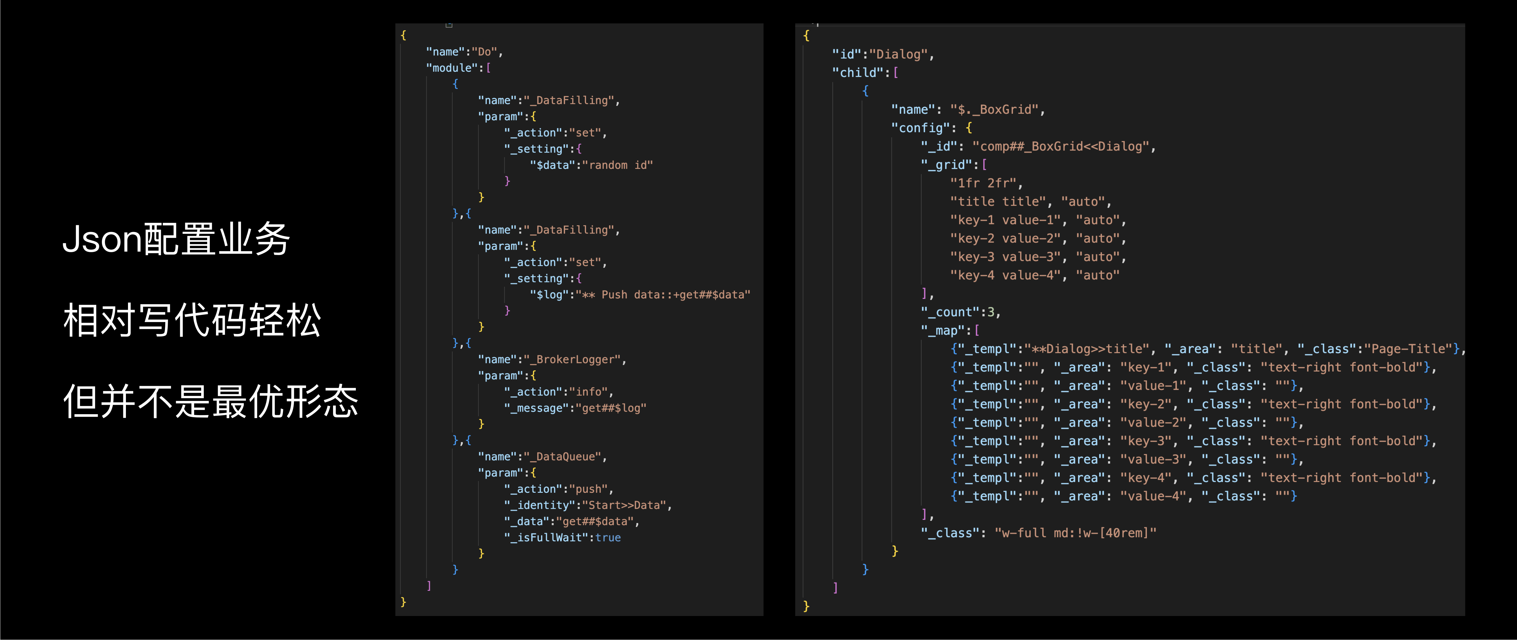 业务代码可以由Json文本配置,再由代码生成器生成为真实的代码。