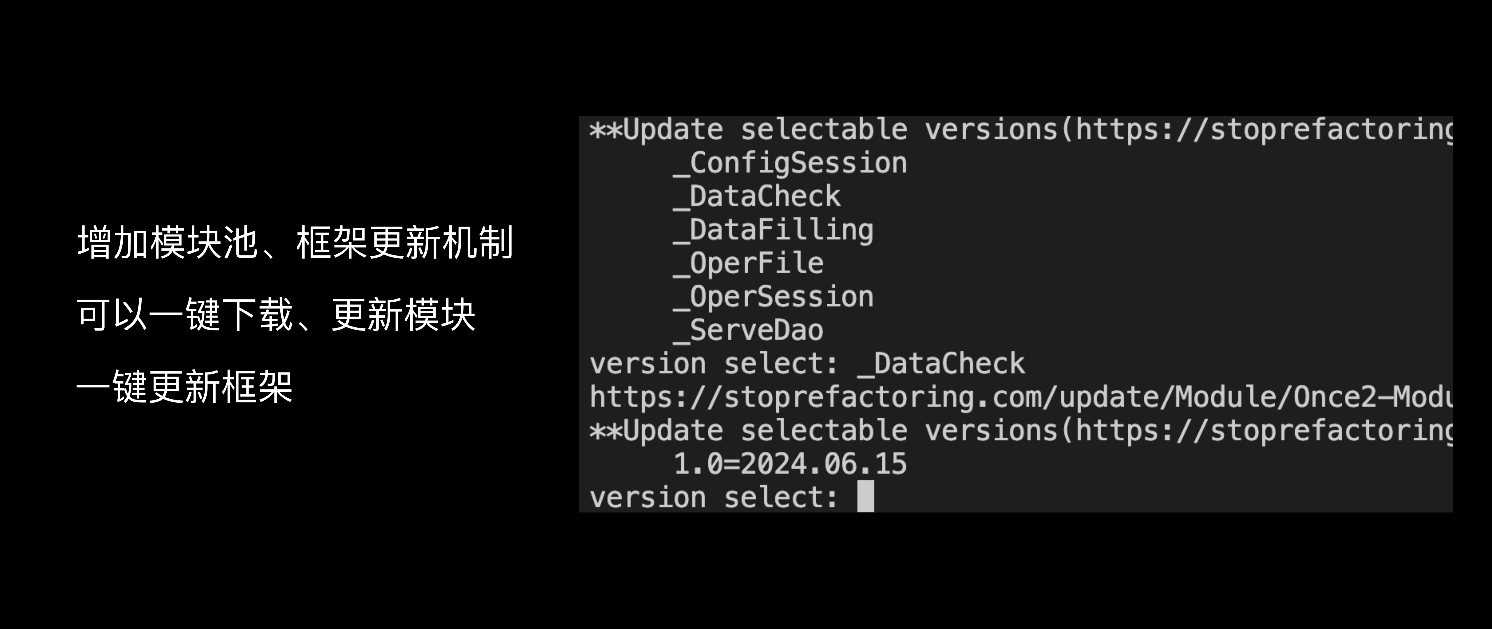 增加了模块、框架更新机制,可以一键下载、更新模块,框架也可以一键更新,这样就不需要某个部分出现BUG时,十几个工程统一手工修改了。