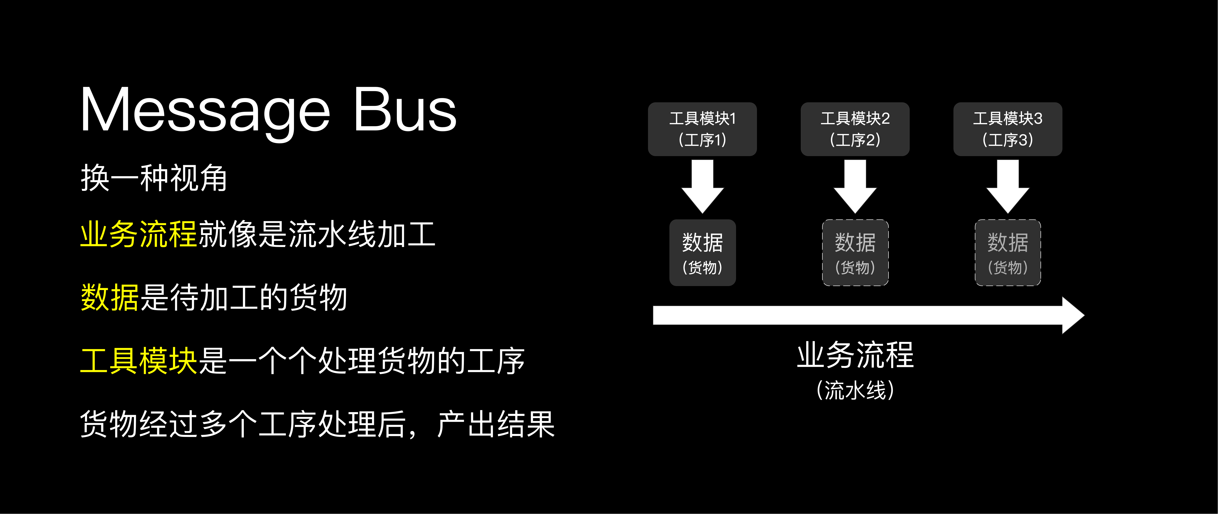 他们提出了message bus的概念,业务流程其实就像是流水线加工,每一个工序完成特定的数据处理后,这组数据会被直接送到下一个工序继续加工,直到最后产出处理完成的数据。
