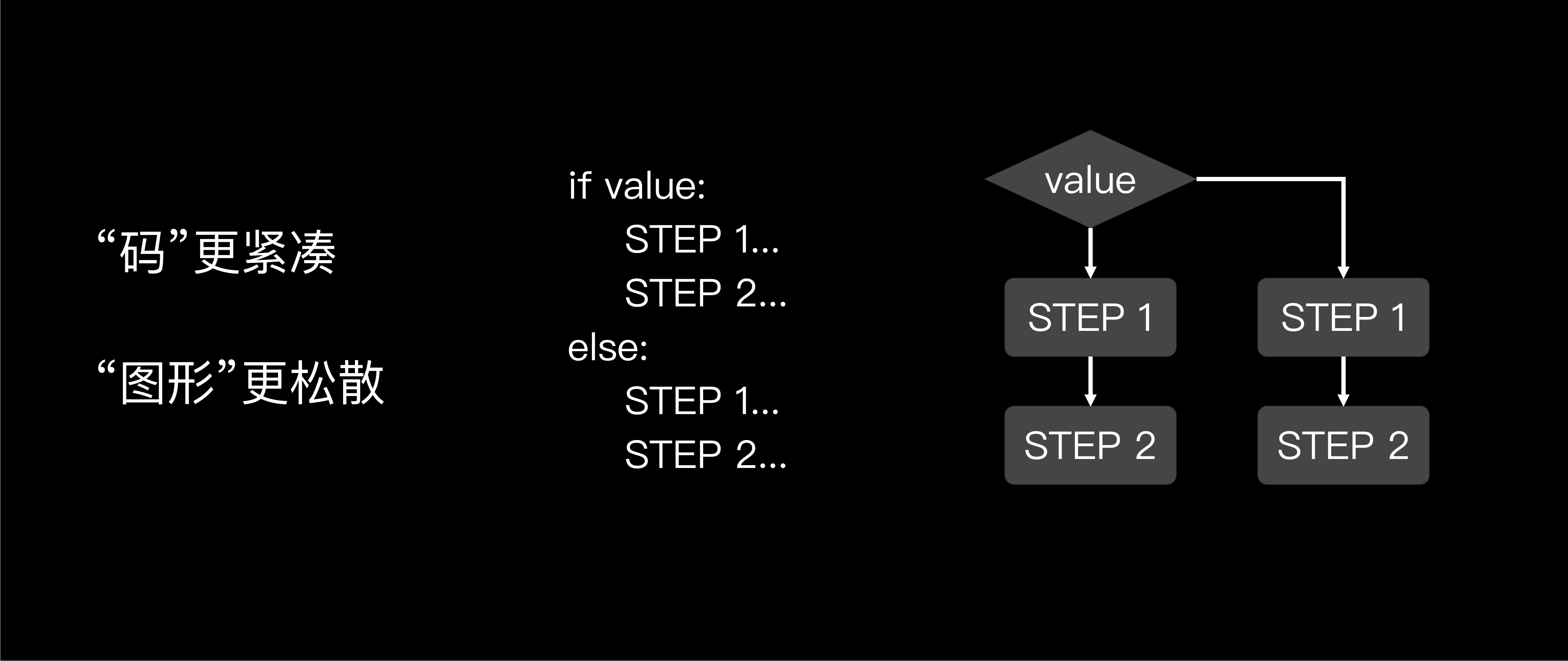 我的理解是,**文字更紧凑,**试想一下如果将1万行代码转变成图形的话,那不就是个巨型蜘蛛网吗,写代码的效率远超图形脱拽的效率。
