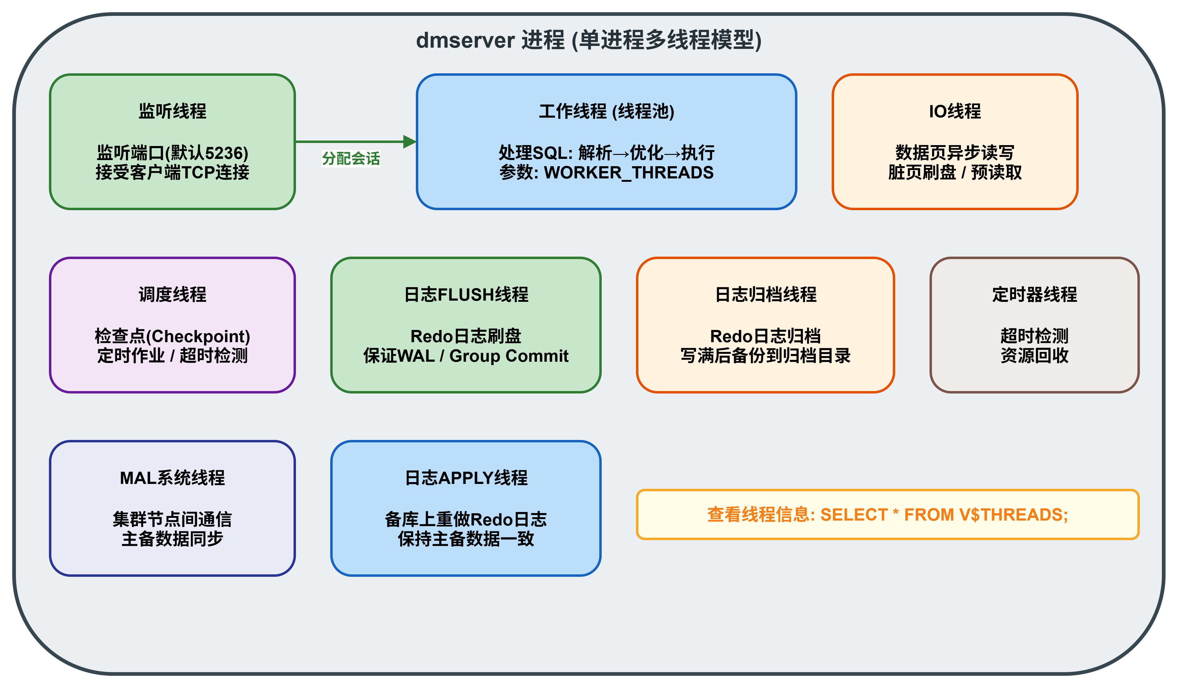 DM8 采用单进程多线程 架构,所有操作在一个 dmserver 进程中通过多个专业化线程协同完成。
