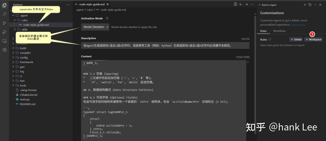 - • Agent 角色 :Agent 负责维护规则的物理索引,并根据当前工作的路径(Workspace)自动识别并挂载对应的