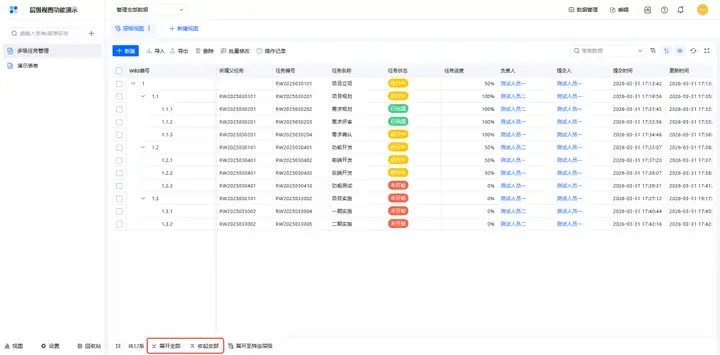 - 展开/收起全部:一键展开或收起所有层级(数据量小于1000时支持全部展开)。