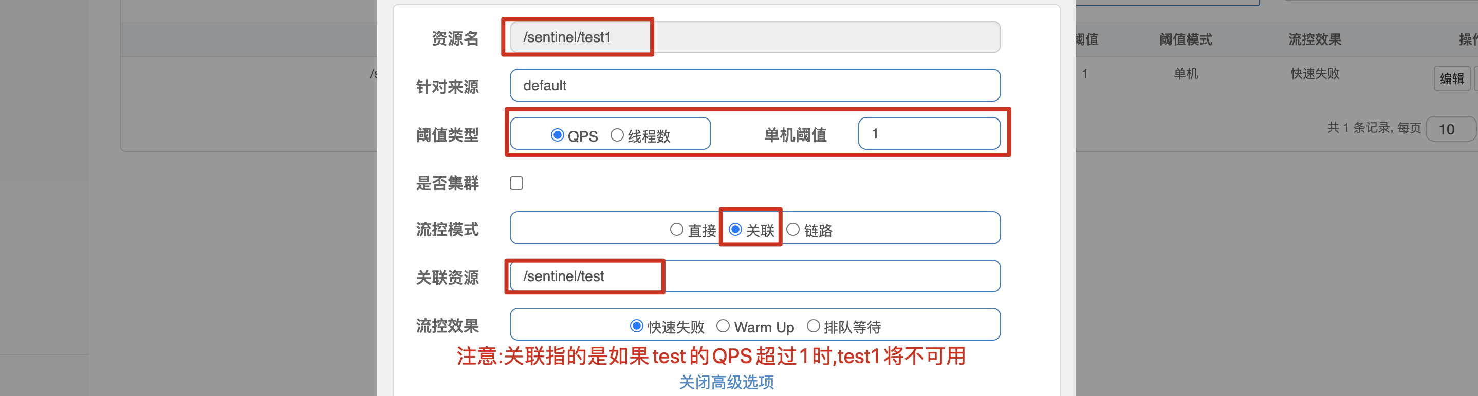 - 直接:标识流量控制规则到达阈值直接触发流量控制