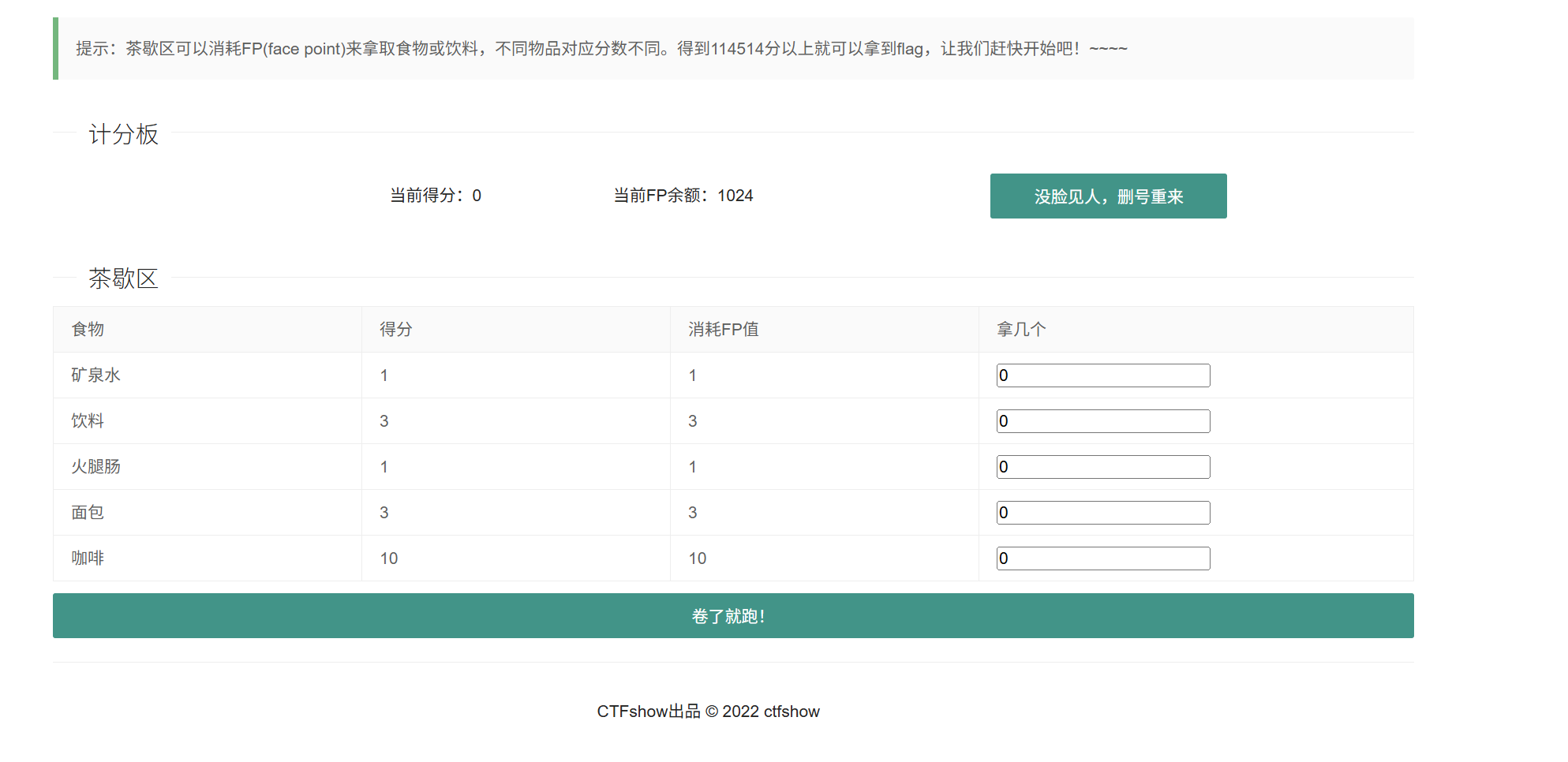 - 题目背景:你有 1024 FP(资金),每种食物得分 = 消耗 FP(比率 1:1)。目标得分 > 114514 才能出 flag。