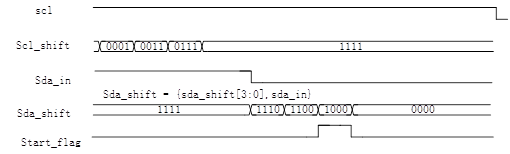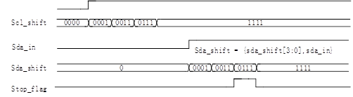 当SCL为高电平时,SDA由高变低表示开始信号。SCL为高电平时,SDA由低变高为停止信号。scl_shift把SCL的电平状态从低位往高位寄存,scl_shift为1111时,代表SCL为高。sad_shift把SDA的电平状态从低位往高位寄存,寄存器sda_shift为1100时表示SDA由高变低,产生开始标志。当寄存器sda_shift为0011时表示SDA由低变高,产生结束标志。