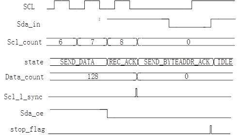 图5 为接收到IIC传来的EEPROM器件地址关键时序,产生开始标志后,SDA线上每接收1个bit数据,scl_count+1,发送一个字节的数据后,判断sda_byte的高7位是否为EEPROM的器件地址,在scl_count为8时发送ACK应答,然后接收IIC传输的寄存器地址。