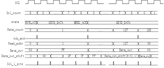 图9为给IIC发送数据的时序,在发送数据期间,每收到一次ACK应答,data_count的值+1,发送的数据data_out来源是ROM模块,hex文件中行数为0-127,所以read_addr的值也为0-127,数据线sda_out的值为data_out_shift的最高位,地址每增加一次,数据data_out都会赋值给data_out_shift寄存器,再根据scl_l_sync来移位,移位7次正好可以把data_out的数值从高到低传输完成。