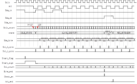 黄色模块为空闲状态,start_sign为产生开始标志后的记号,开始标志产生后,它保持为1,当SCL拉低后,在scl_l_sync =1处状态跳转到ALAVE_IDENTIFY。
